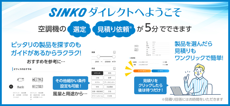 空調機の選定って難しそうなイメージがありますよね。でも大丈夫、SINKOダイレクトなら、会員登録をいただくことで検索制限なく建築用途等から候補を提案いたします。